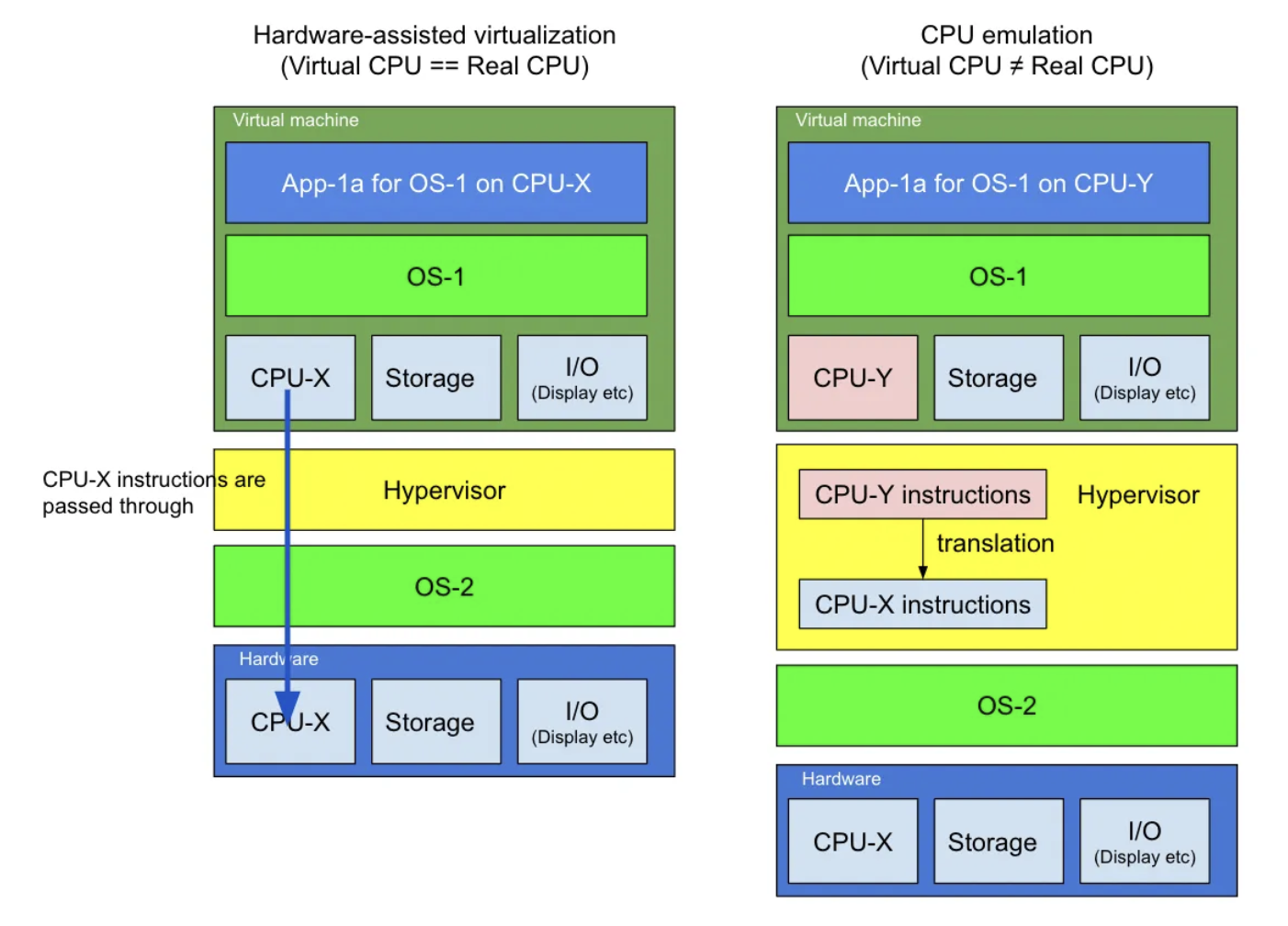 emulation -> CPU(hw) emulation ( ex : x86 -> arm )