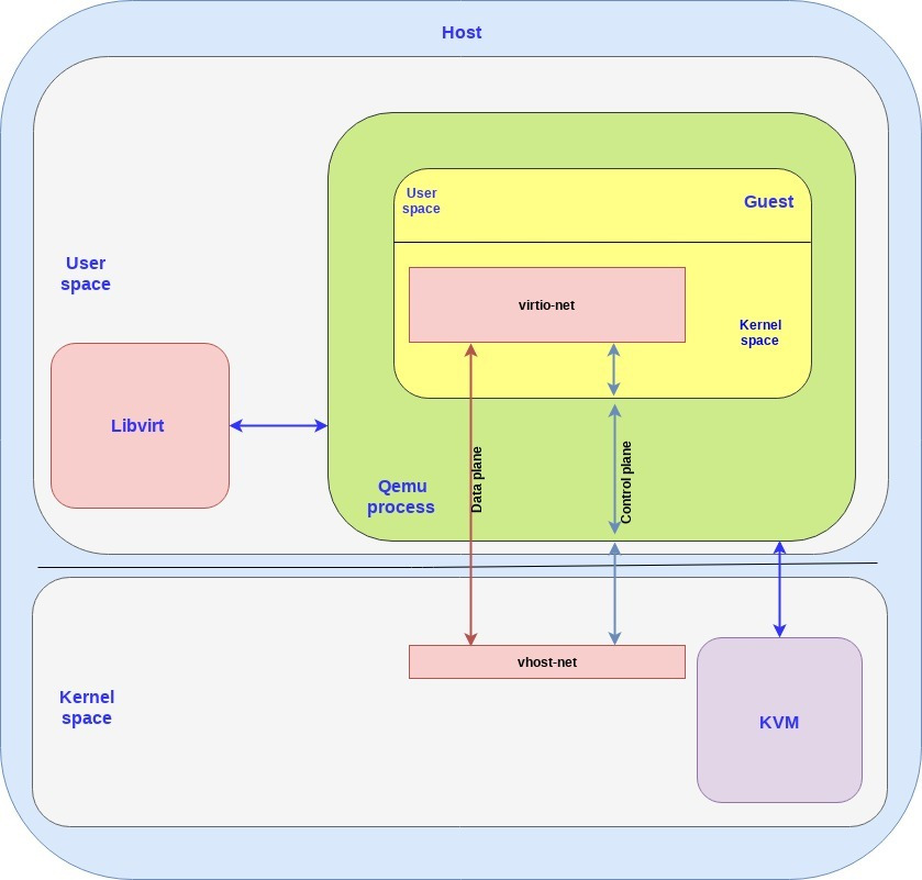 virtio의 control plane 은 qemu process에 구현되며 data plane은 qemu process 밖(vhost-net 과 virtio-net 사이 공유메모리)에 구성된다.