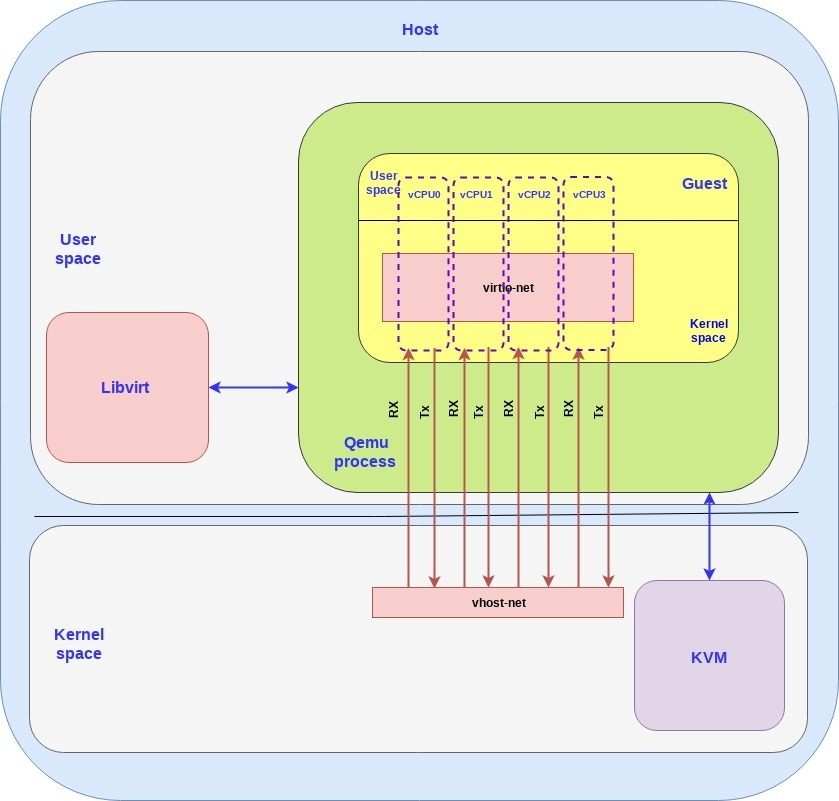 virtio-networking 은 host 쪽 vhost-net과 guest 쪽 virtio-net 으로 구성된다.