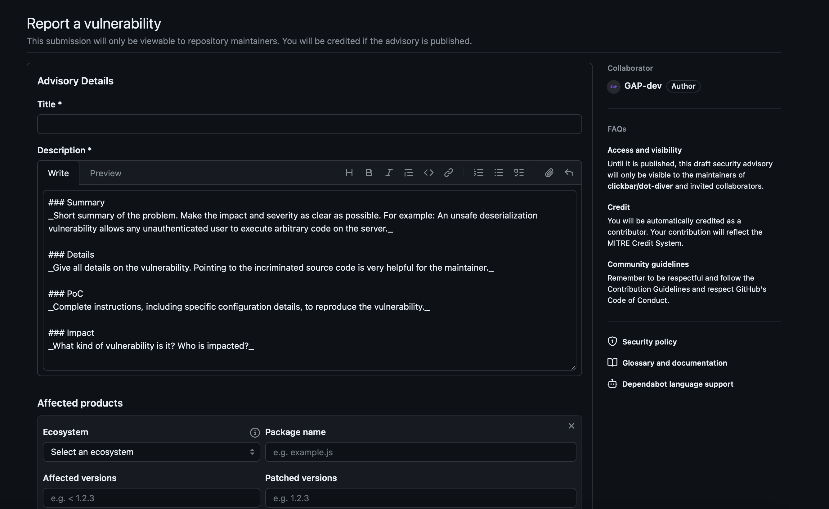 github에 공개된 repo에 security.md가 활성화 되어 있다면, 아래 기능을 이용할 수 있다.