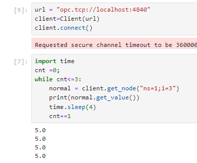 예상대로 5가 출력된다. 이를 통해, 이미 개발 된 opcua lib을 사용하여 python으로 opc-ua 통신이 가능하다는 것을 확인하였다.
